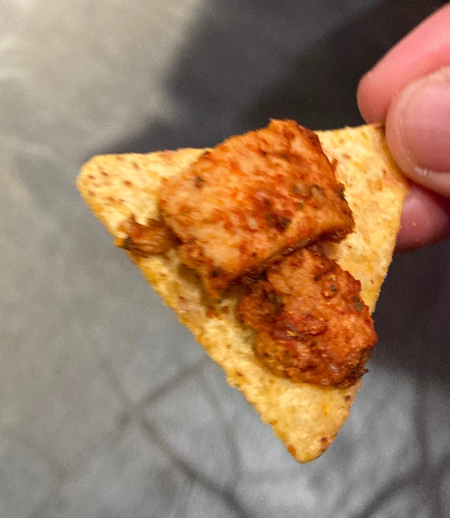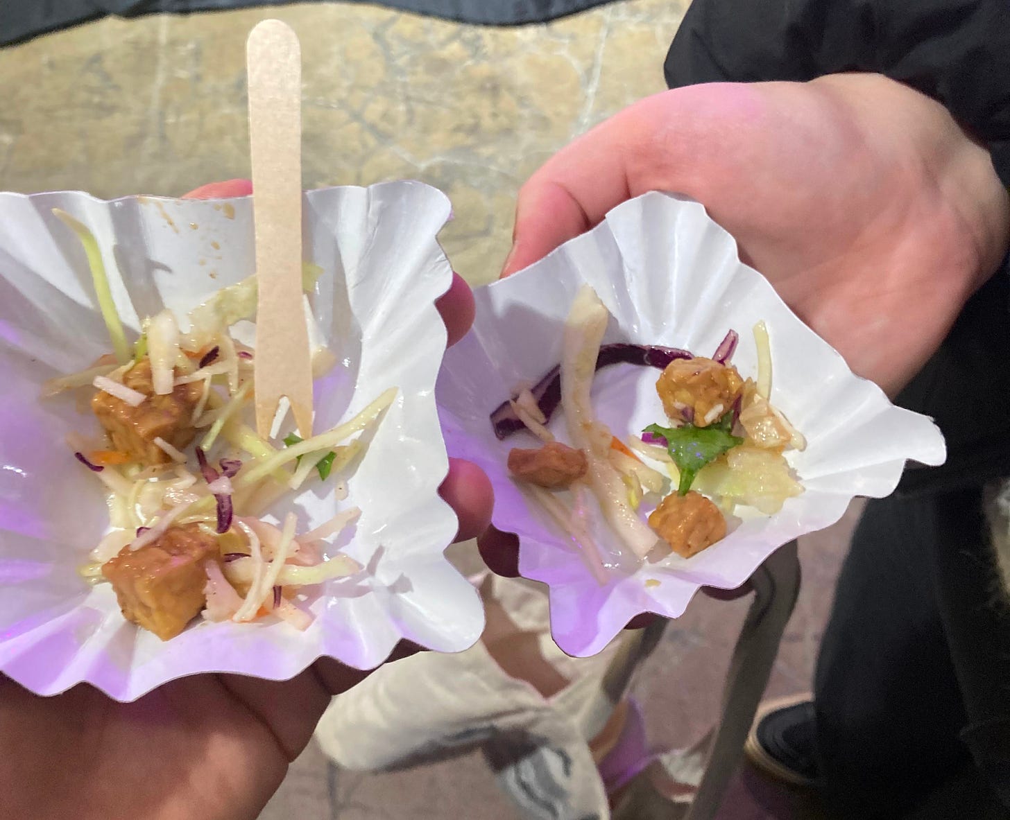 At Vegemessut, they were offering samples of what looked like a vegan chicken taco protein. It paired really well with the tortilla chip they used, though I imagine it would be even better in actual tacos or burritos.