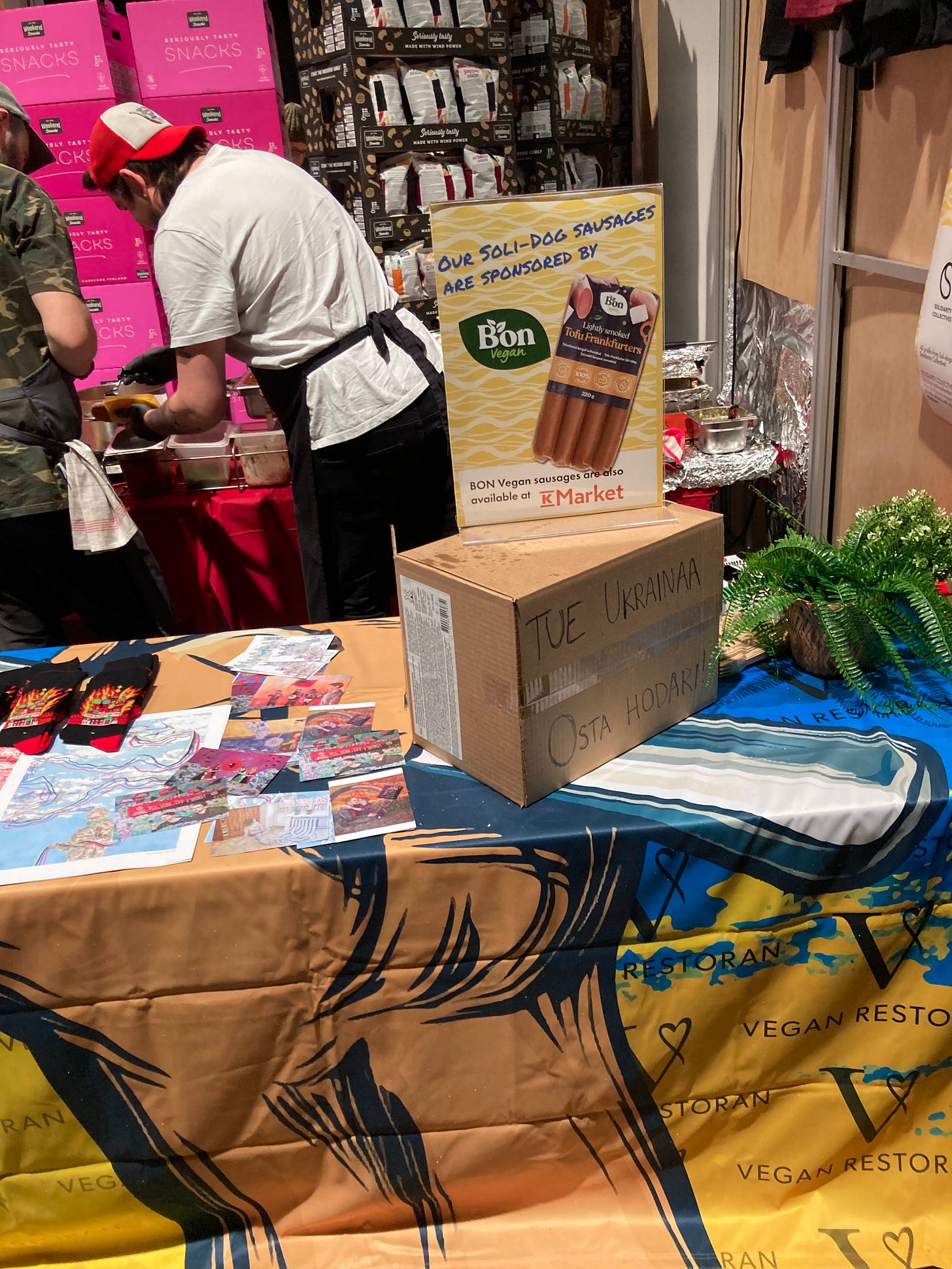 Vegan Restoran was selling hot dogs for 7 euros each, which felt a bit pricey, but I bought one to support Ukraine.